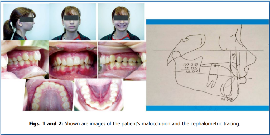 An adolescent female patient (Figs. 1 and 2) presented with a bilateral Class II malocclusion, maxillary and mandibular arch length discrepancies, a midline discrepancy, excessive overjet and overbite, and an excessive A-B discrepancy of 9 mm. I prefer using Natural Head Posture,1 rather than SNA, SNB and the Frankfort Horizontal.2 Still, the maxillary incisor had an ideal position in relation to the A-line,3 and the upper lip had an ideal position and measurement according to Holdaway’s subnasale line,4 while the mandibular incisors were retruded. Clearly, one would not want to retract the maxillary dentition and risk streamlining an otherwise ideal upper lip.